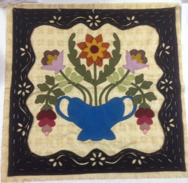 This is what I have been working on over the last month. "Aunt Bettina's Parlour" by Quilted Crow Girls Designs. I started it I can't remember when at a class at Hettie's Patch earlier this year. I am enjoying hand stitching! It's all very relaxing and fun.